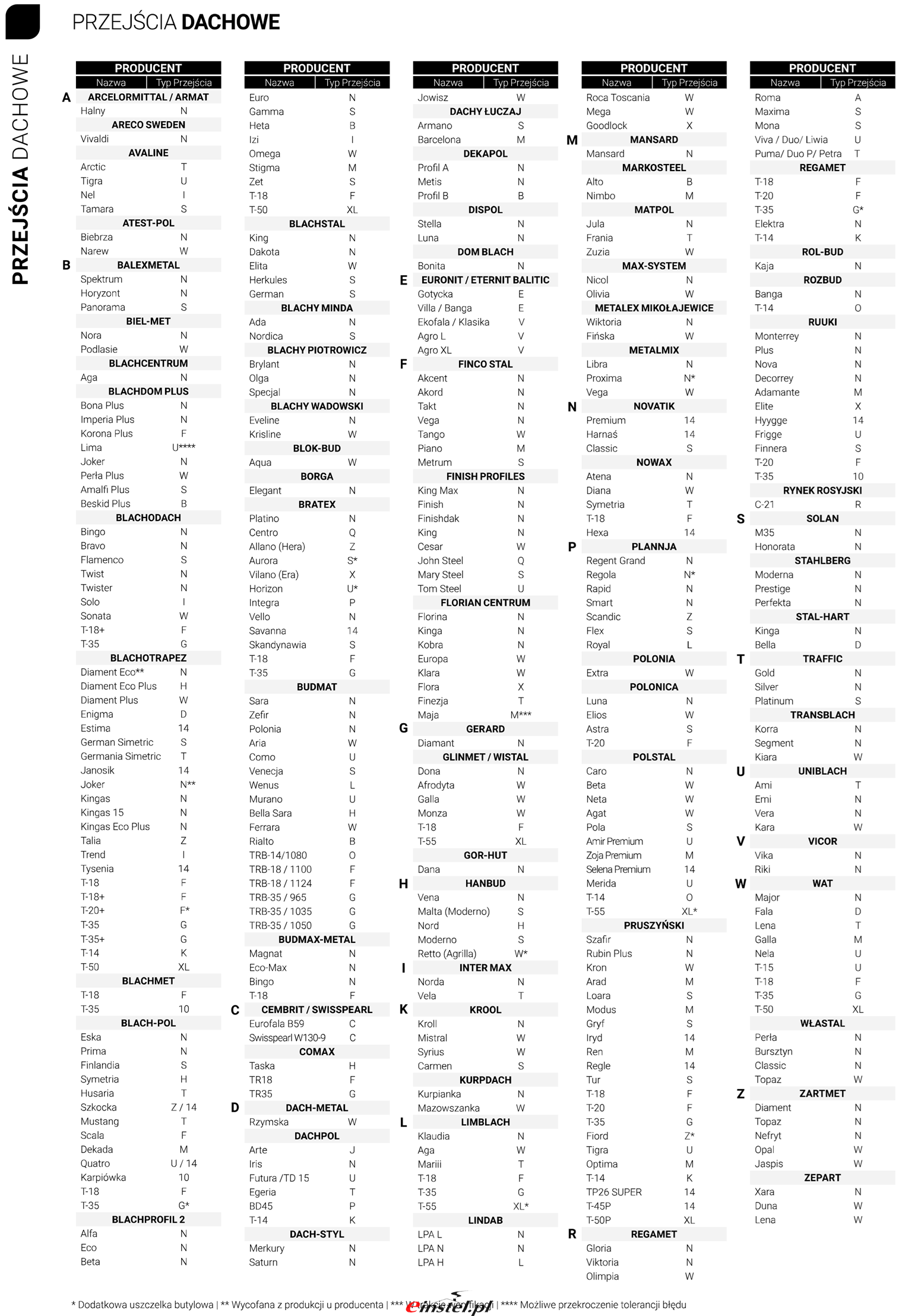 - dostępne profile blachodachówki: A, B, C, D, E, H, I, J, L, M, N, P, Q, S, T,U, W, X, Z